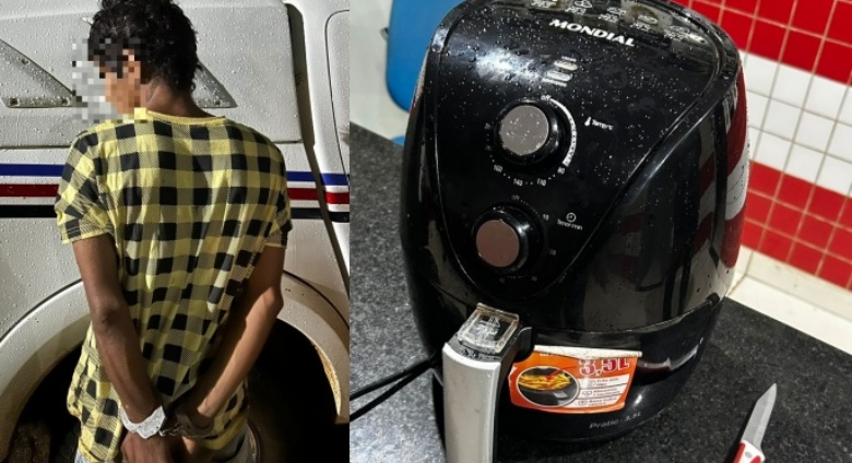 Após análise das imagens, o suspeito foi reconhecido, sendo identificado como indivíduo com diversas passagens pela polícia. A guarnição realizou rondas nas proximidades e conseguiu localizar o autor. O suspeito foi abordado e com ele foi apreendido 1 arma branca (faca), 1 Air Fryer Mondial e conduzido à Delegacia de Polícia Civil para as providências cabíveis.