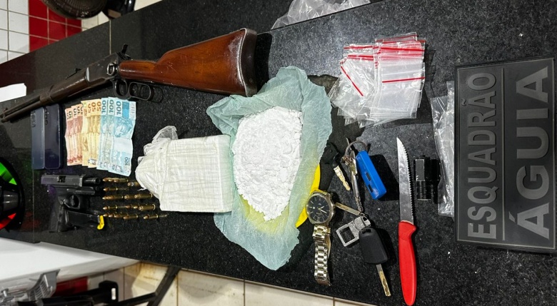 Foi apreendido um rifle, cocaína pronta para comercialização, munições de calibres 9 mm, carregador, um veículo Onix, uma motocicleta Biz, celulares, dinheiro em espécie e outros objetos. #OMaranhaoSeInformaAqui